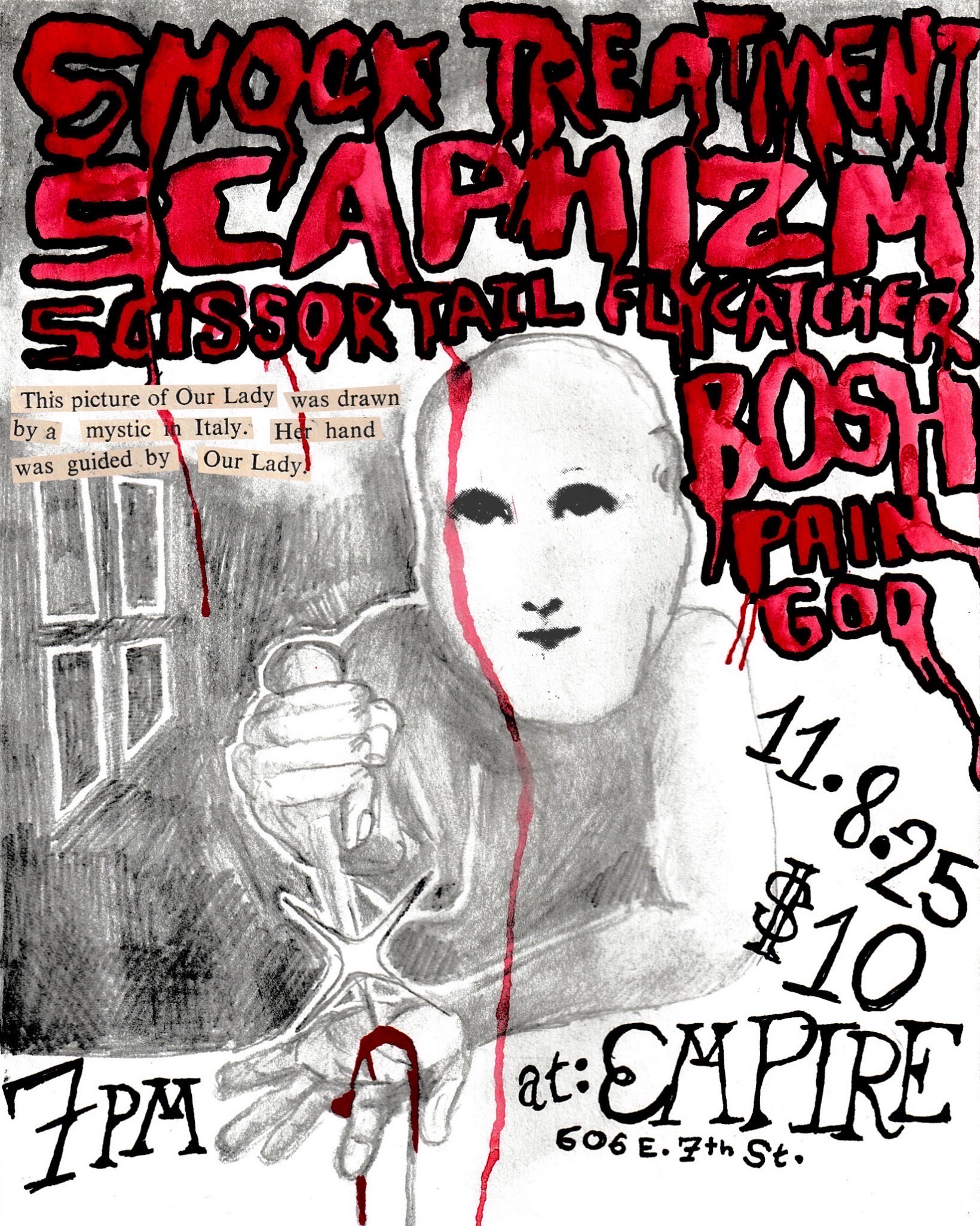 Heard Presents: Shock Treatment w/ Scaphizm, Scissortailflycatcher, Pain God, and Bosh in the Control Room Heard Presents: Shock Treatment w/ Scaphizm, Scissortailflycatcher, Pain God, and Bosh at Empire Control Room on November 8th, 2025 Doors: 7:00pm / Show: 8:00pm TICKETS: $10 – $12 SOCIALS: Instagram | Twitter | Spotify | YouTube All Ages 00 days 00 hours 00 minutes 00 seconds Date Nov 09 2025 Time 7:00 pm Buy Tickets