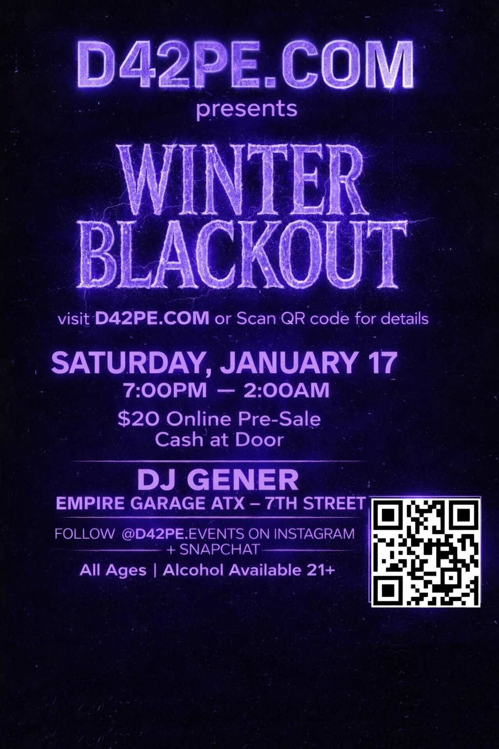 D42PE Presents: Winter Blackout w/ DJ Gener in at Empire Garage on Saturday, January 17, 2026